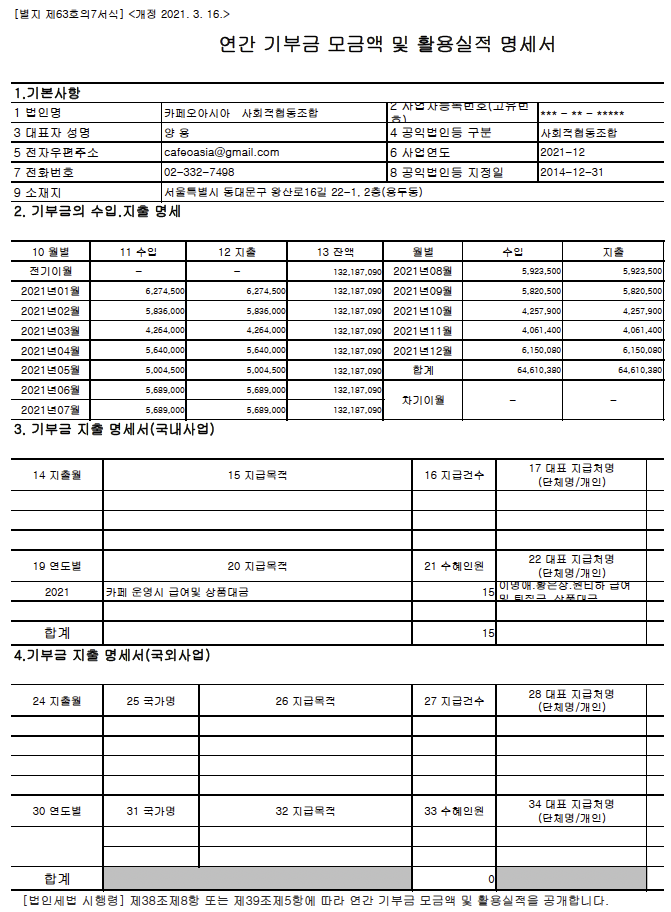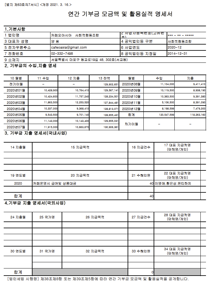 후원문의 카페오아시아의 기부금 사용내역을 소개합니다. 2024년 기부금 사용내역 2023년 기부금 사용내역 2022년 기부금 사용내역 2021년 기부금 사용내역 2020년 기부금 사용내역 2019년 기부금 사용내역 2018년 기부금 사용내역 2017년 기부금 사용내역 2016년 기부금 사용내역 2015년 기부금 사용내역 2014년 기부금 사용내역 국세청 바로가기